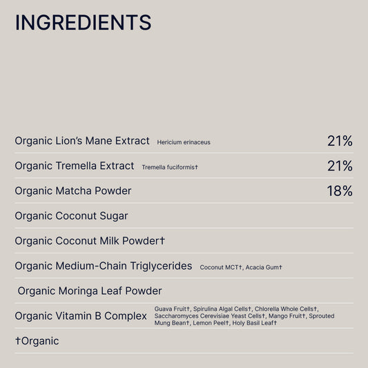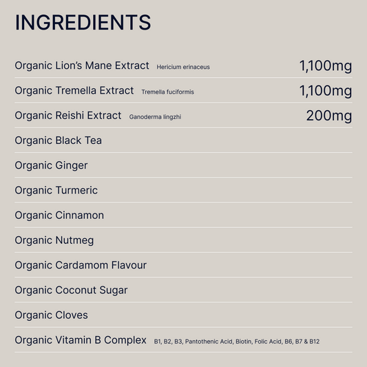 - Mushroom Matcha Super Blend: A fresh, grassy matcha flavour balanced by the smoothness of Lion’s Mane and Tremella for sustained energy.