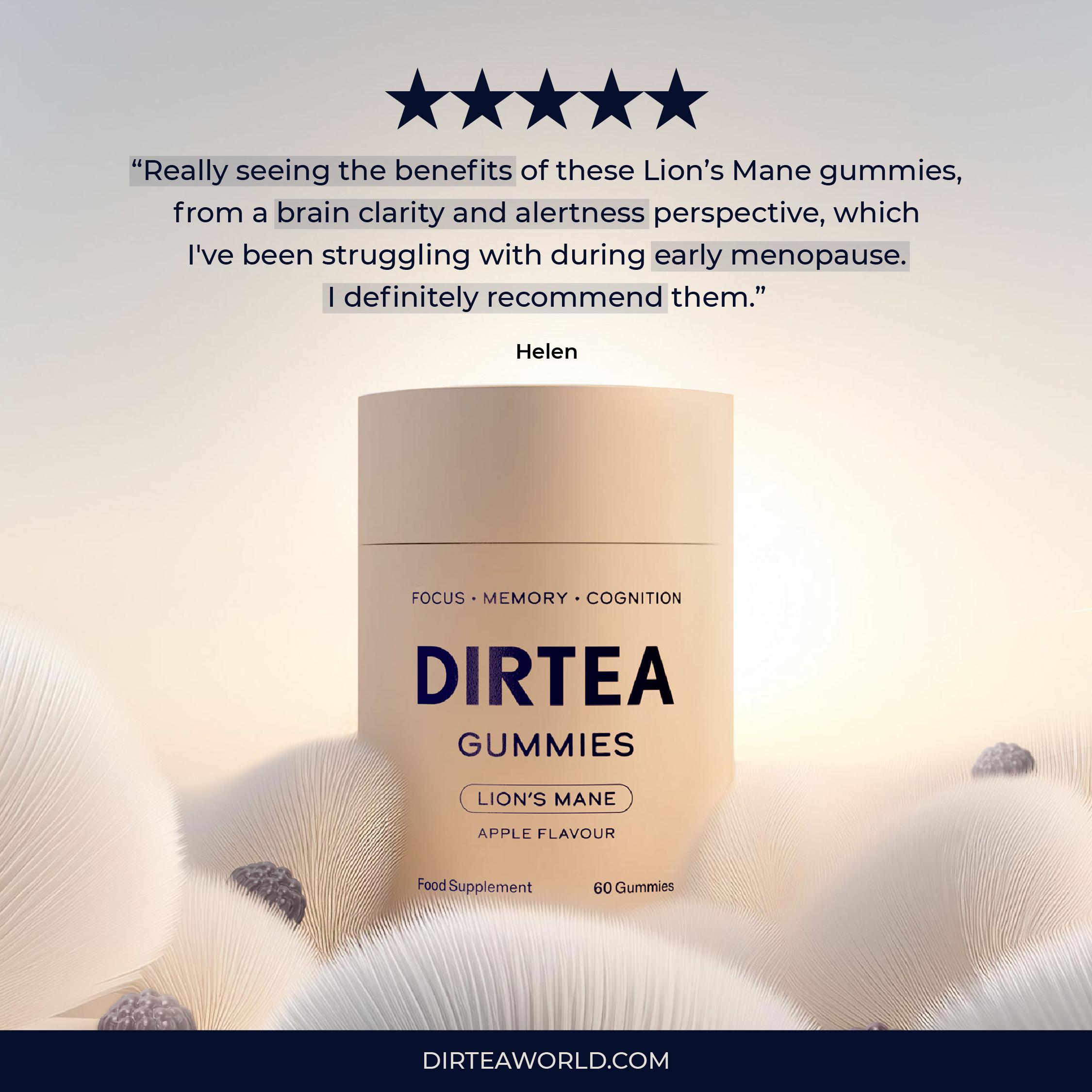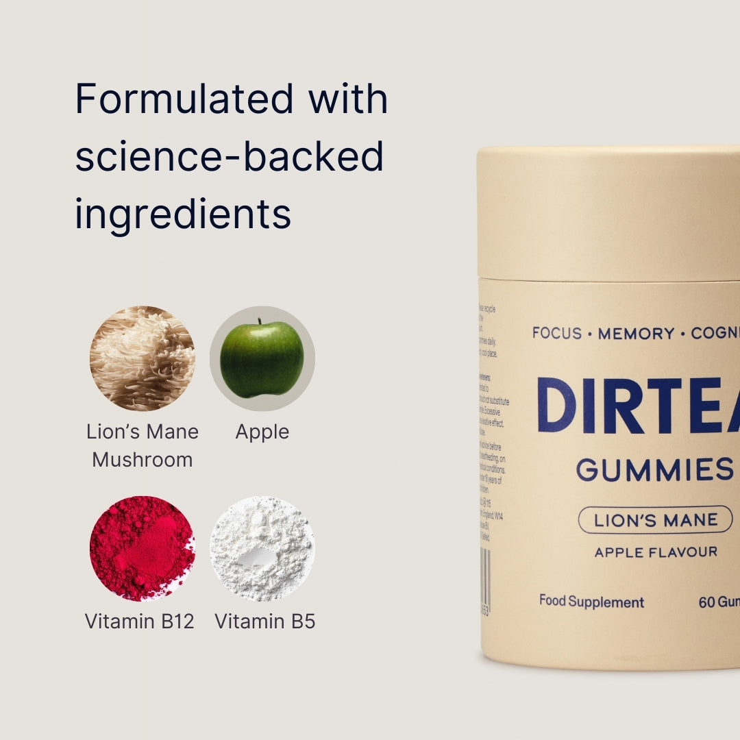 DIRTEA provides the purest and most potent mushrooms around. With functional fungi growing in popularity, knowing your sources and finding a brand you trust has never been more important. For example our Lion's Mane Gummies are packed with 2,400mg of Lion’s Mane extract and 100% of your daily recommended intake of Vitamins B12 and B5, offering powerful support for cognitive function and memory while helping to reduce tiredness and fatigue.