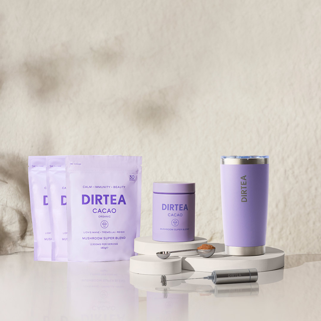 DIRTEA Cacao blends rich, organic cacao with Lion’s Mane, Tremella, and Reishi for a velvety, adaptogenic drink that supports relaxation, focus, and overall well-being.