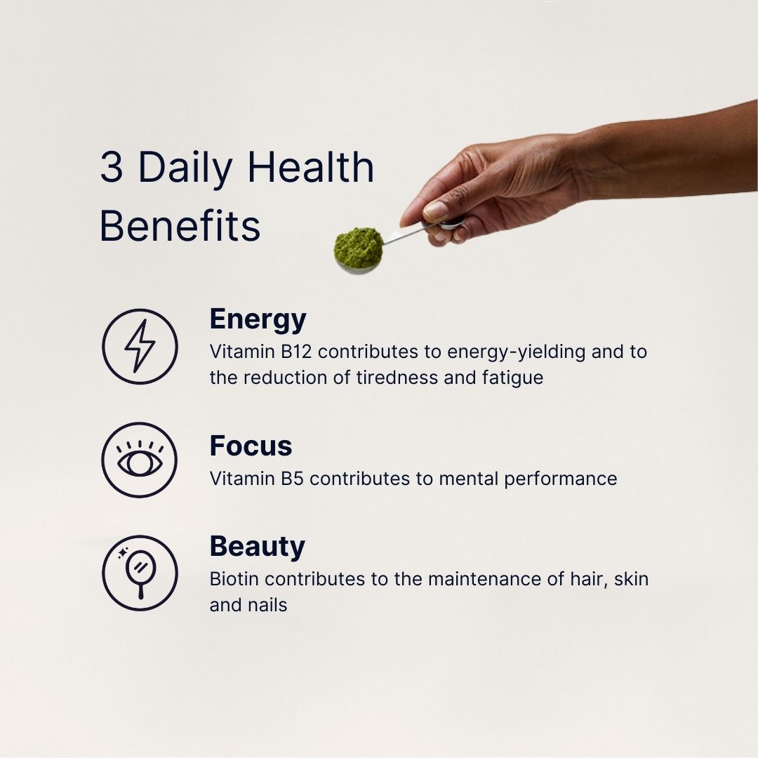 DIRTEA Matcha is high in antioxidants, particularly catechins like epigallocatechin gallate (EGCG), which may help protect the skin from free radical damage. Free radicals can cause early signs of ageing, wrinkles, and fine lines, but antioxidants can help counteract this damage and help maintain youthful skin. Additionally, the B Vitamin complex in DIRTEA Matcha powder includes biotin, which plays a vital role in supporting the health of hair, skin, and nails. This blend also features Tremella extract, which contributes to a hydrated, plump, and glowing complexion. Together, these elements work to enhance your overall skin health and appearance.