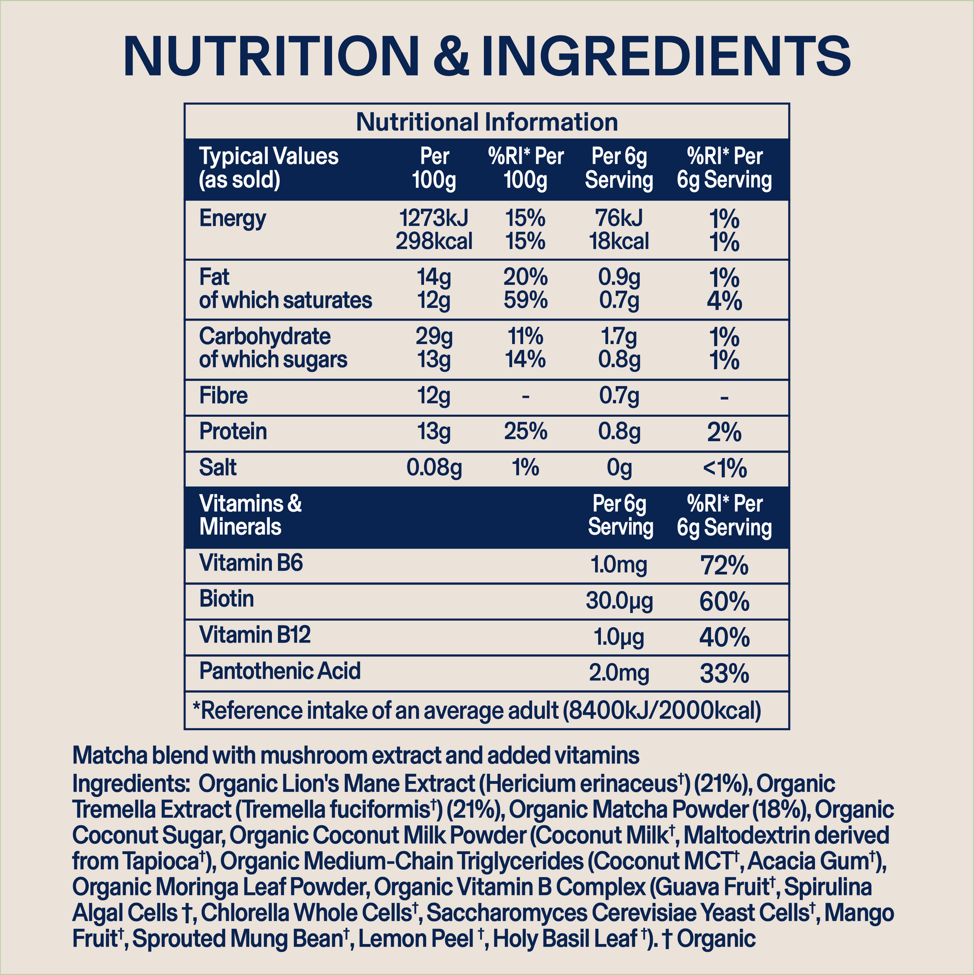 - Lion’s Mane enhances cognitive function and focus, working synergistically with matcha’s natural energy boost.
