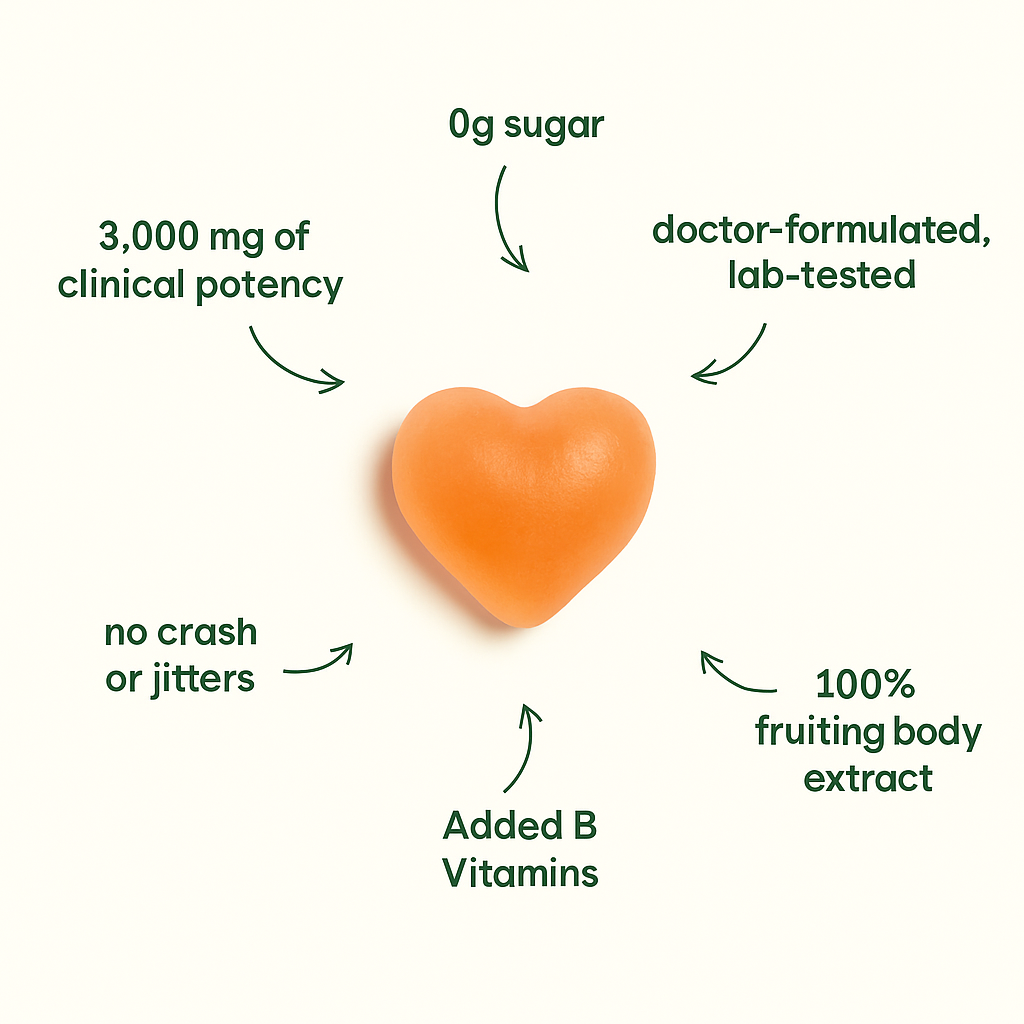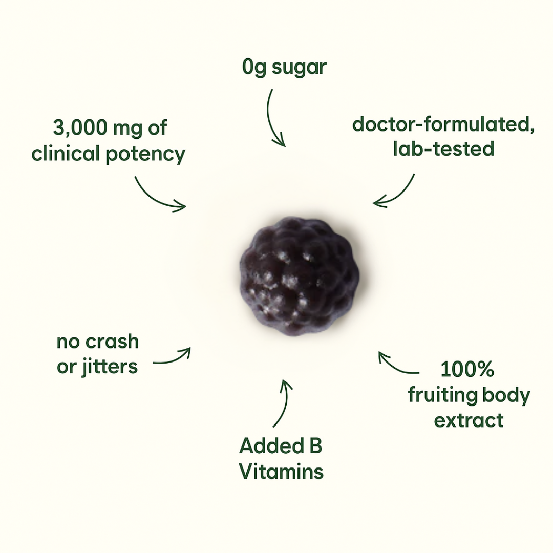 Packed with 3,000mg of Cordyceps, plus Vitamins B3, B5, and C, this delicious fruity mixed berries-flavored gummies are your perfect daily boost. They help reduce fatigue, maintain vitality, and support endurance throughout the day.
