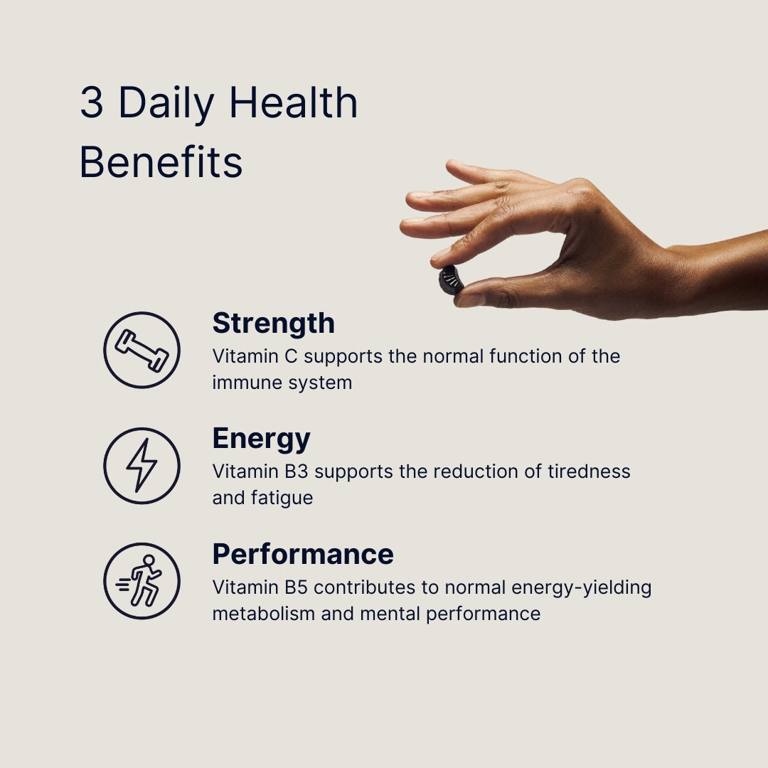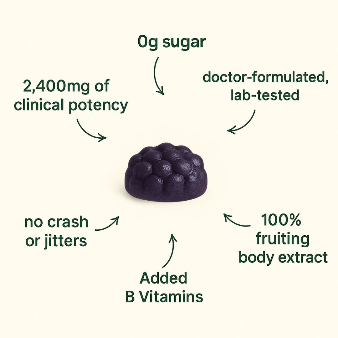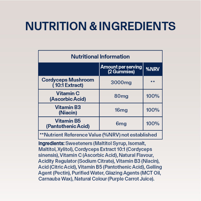 Mixed berries-flavoured gummies with Cordyceps mushroom extract, Vitamins B3, B5, and C.