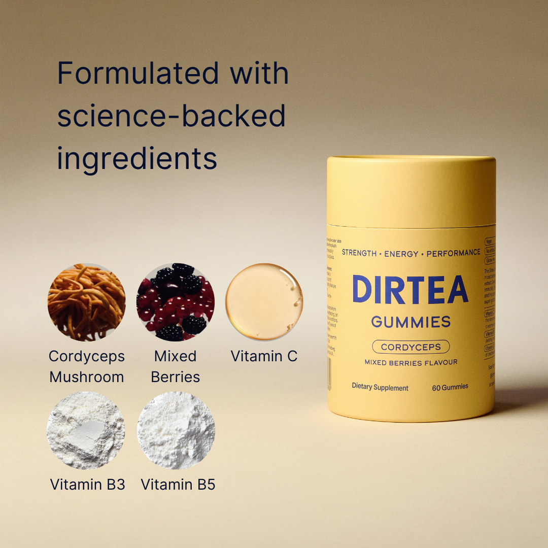 DIRTEA Cordyceps Gummies, with zero sugars and natural flavors, deliver natural strength and energy in every bite.