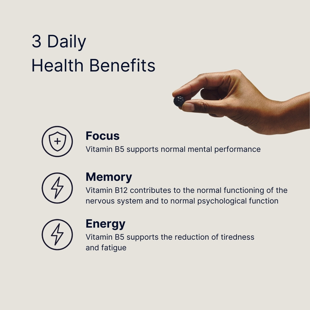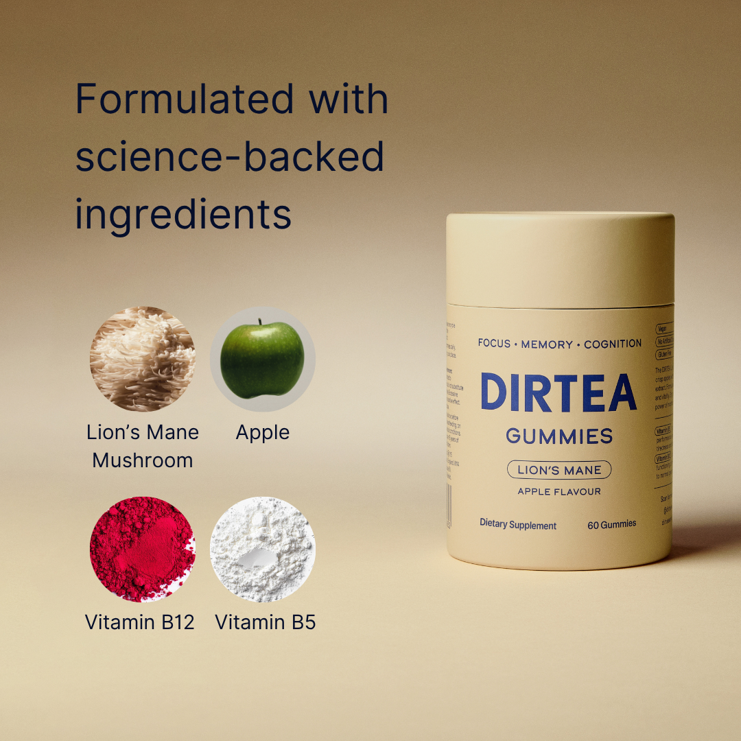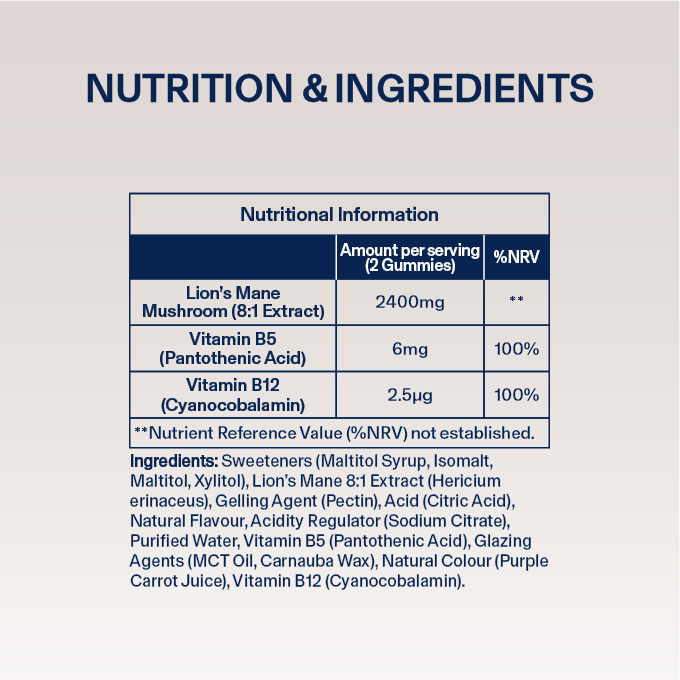 Apple-flavoured gummies with Lion's Mane mushroom extract, Vitamin B5 and B12.