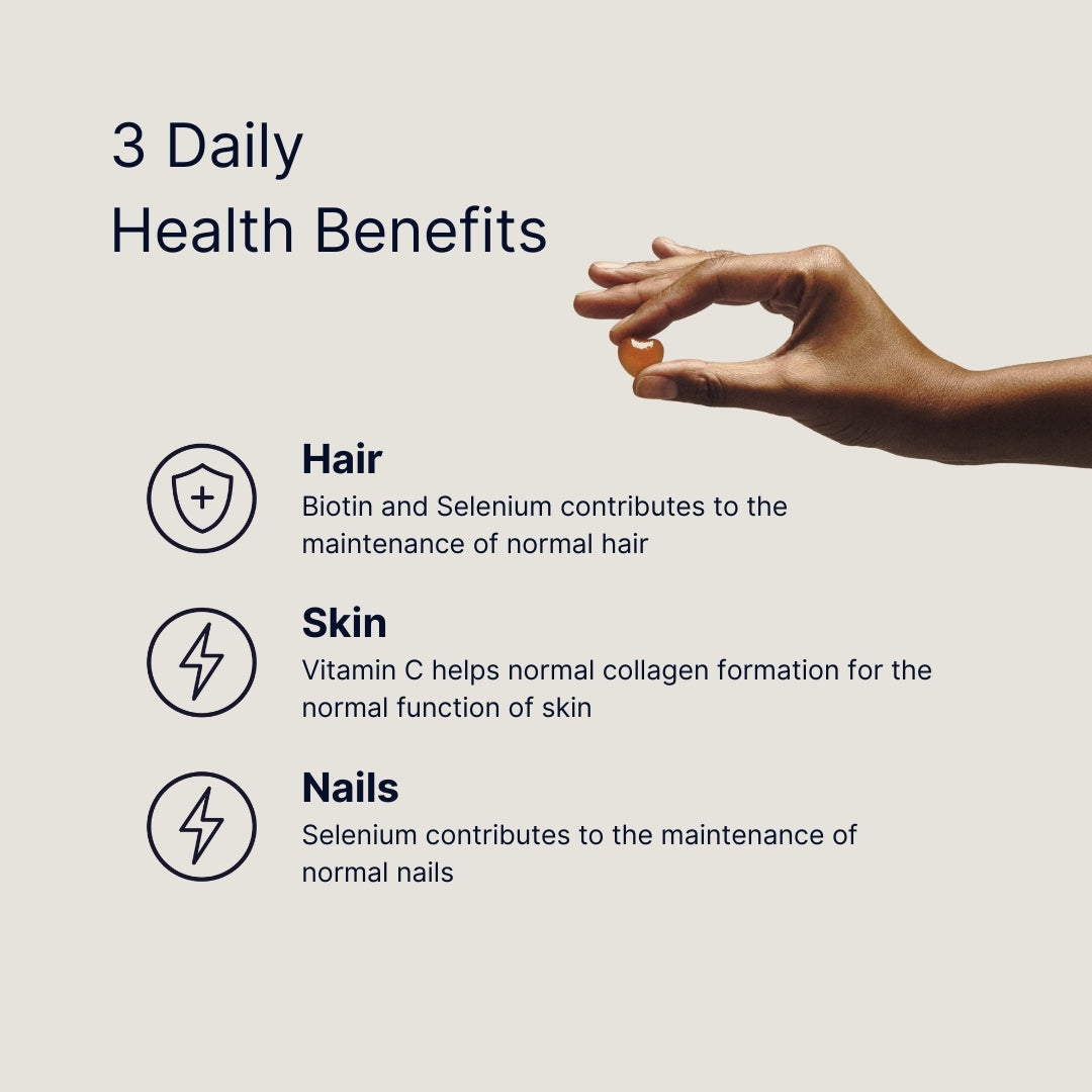Peach-flavoured gummies with Tremella mushroom extract, Biotin, Vitamin C, Selenium, Zinc, Vitamin A and Vitamin E.