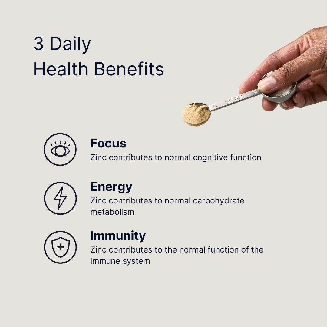 Each serving of DIRTEA Lion’s Mane powder is fortified with Zinc, an essential mineral that contributes to normal cognitive function, immune support, and cell regeneration.